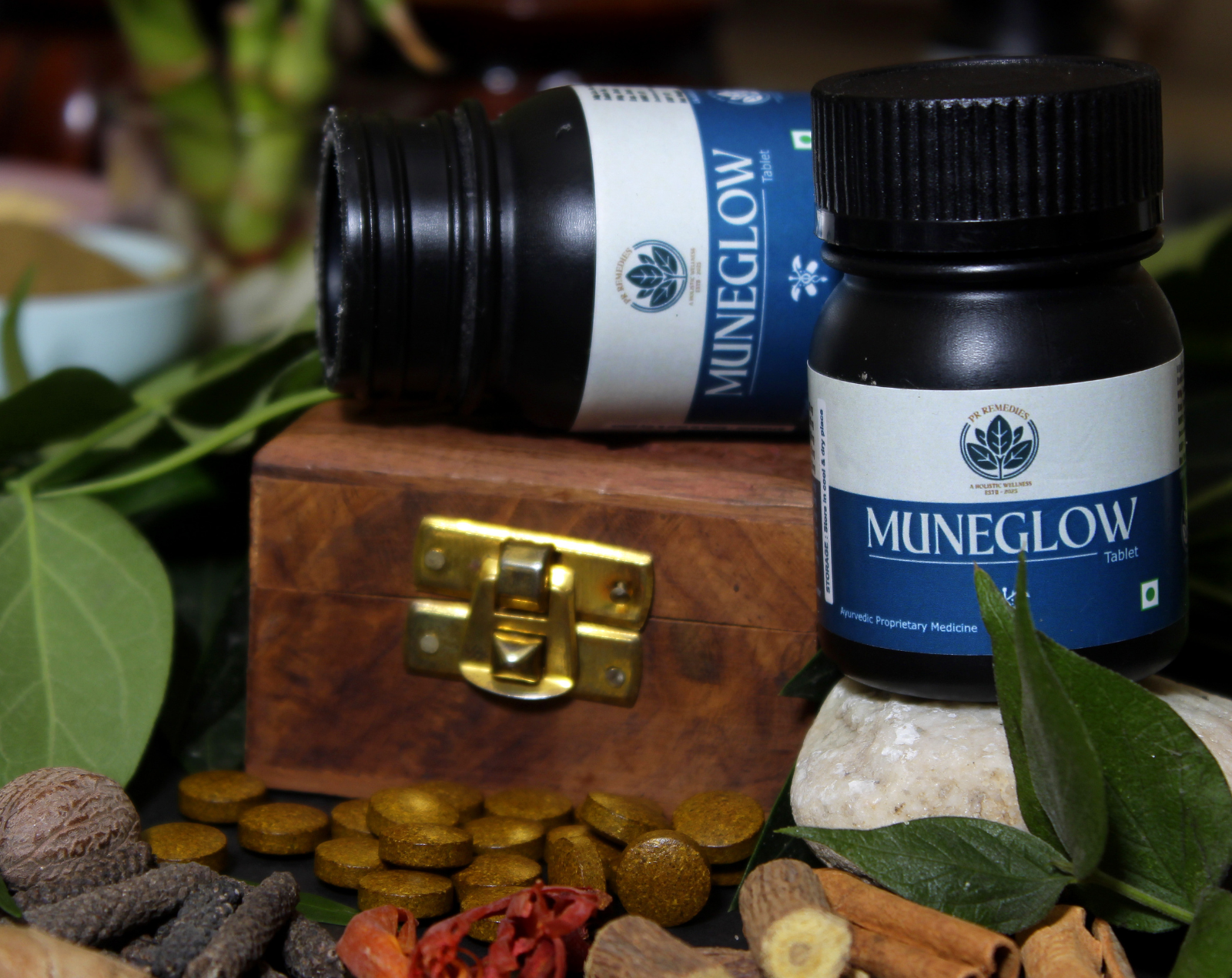 MuneGlow is an Ayurvedic immunity and skin health tablet formulated to strengthen the body’s natural defense system, purify blood, enhance skin glow, and protect against recurrent infections. It supports internal detoxification and promotes clear, healthy, and radiant skin.